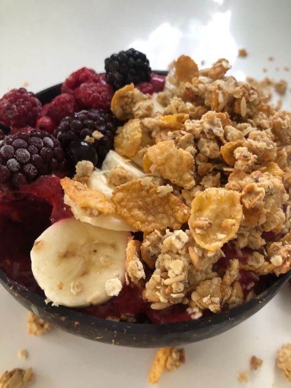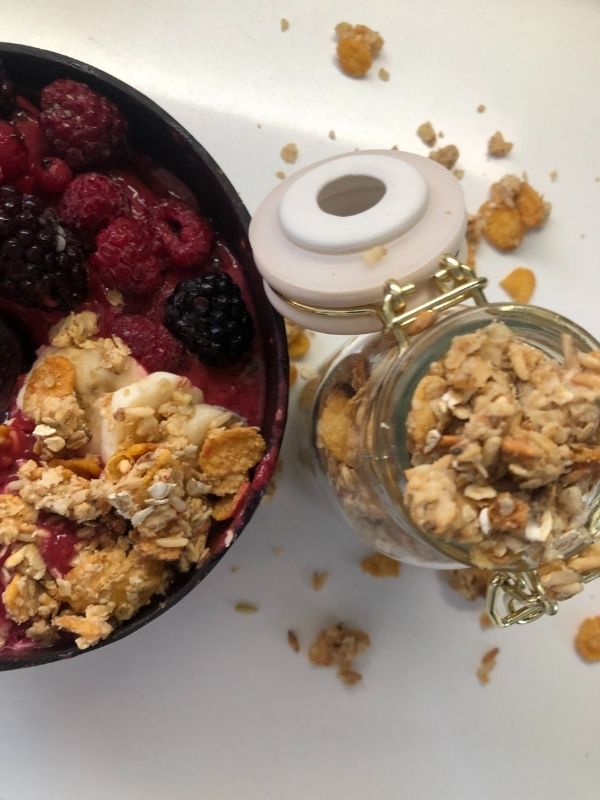 • Mit Goldflöckchen Granola, Banane, Beeren oder anderen Toppings deiner Wahl verzieren und genießen!