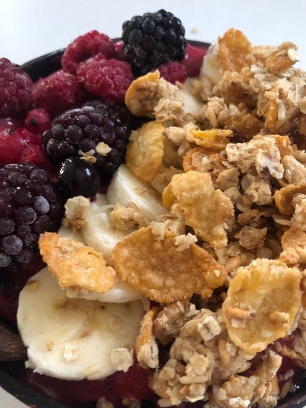 ….ist auch da. Aber nicht um die Bowl zu essen, sondern um sie zu verbessern. Sowohl geschmacklich, als auch optisch. Ich habe meine Bowl mit dem Goldflöckchen Granola, Banane und Beeren getoppt. Ein bisschen Honig durfte auch nicht fehlen.